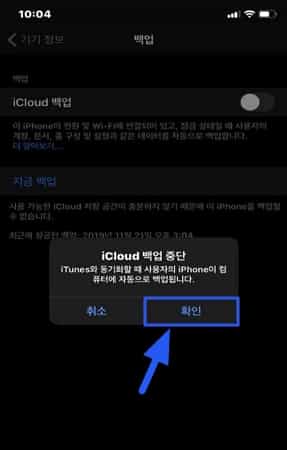 iCloud 백업을 중단하고싶다면 위 활성화된 버튼을 해제하면 되겠습니다. 간단한 확인 문구와 함께 손쉽게 해제를 할 수 있습니다.