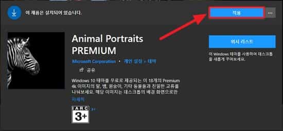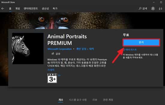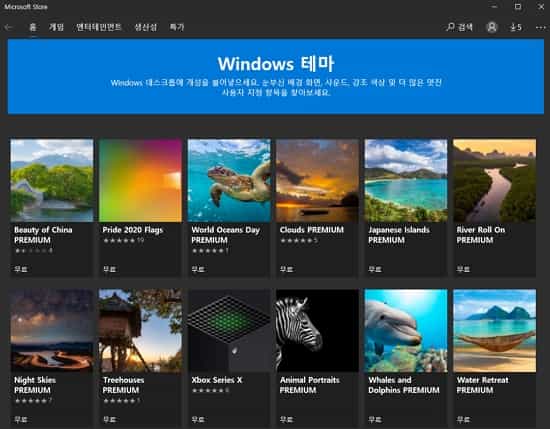 원하는 테마를 선택했다면 받기 버튼을 클릭합니다. 마이크로소프트 스토어에서 다운로드가 완료되면 테마 메뉴에 저장할 수 있습니다.
