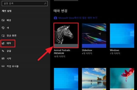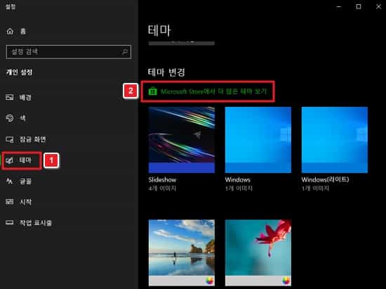테마 메뉴에서 테마 변경이 가능합니다. 원하는 테마가 없다면 마이크로소프트 스토어에서 무료로 제공하는 다양한 테마를 확인할 수 있습니다.