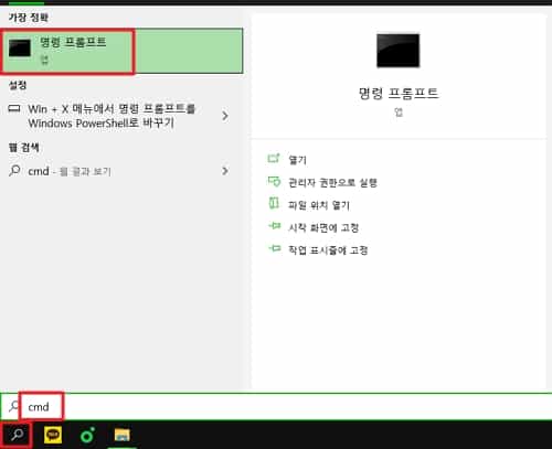 먼저 명령 프롬포트를 열기 위해 검색 창에 cmd를 입력합니다. 명령 프롬포트를 클릭하면 접속할 수 있습니다.