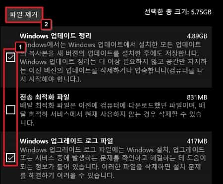 윈도우 임시 파일은 전부 필요없는 파일로 이루어져 있으므로 모든 부분을 선택하는 것이 가장 좋습니다. 모든 부분을 다 체크하고 파일 제거를 클릭합니다.