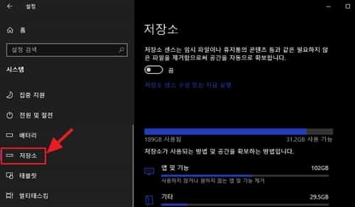 좌측 탭에서 저장소 혹은 저장 공간 메뉴를 클릭합니다. 이후 오른쪽에 보이는 화면에서 임시 파일을 선택합니다. 임시 파일의 용량이 적더라도 한 번 정도는 보고 자세한 용량 차지 비율을 확인하는 것이 좋습니다.