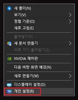 바탕화면이나 테마와 관련된 설정을 위해서는 윈도우 개인 설정에 접속해야 합니다. 바탕화면 빈 곳에 우클릭을 하고 개인 설정에 접속합니다.