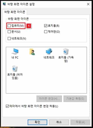 기본 설정은 처음 바탕화면에서 설정할 때랑 같습니다. 이 중 원하는 바탕화면 아이콘을 선택합니다. 이번 편에서는 내컴퓨터 아이콘 설정을 예시로 들겠습니다. 컴퓨터에 체크를 해줍니다.