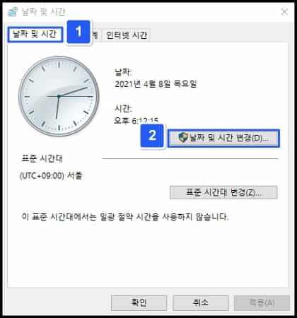 먼저 우측 하단 시계를 클릭하고 날짜/시간 조정 메뉴에 접속합니다.