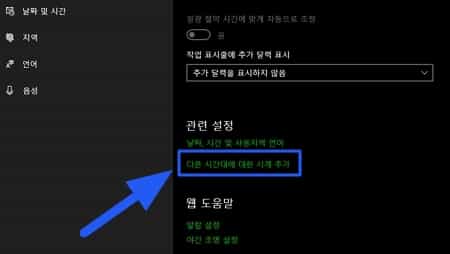 다른 시간대에 대한 시계 추가 버튼을 클릭하고 날짜 및 시간 탭에서 날짜 및 시간 변경, 달력 설정 변경 순으로 접속합니다. 요일 한 번 설정하는데 굉장히 많은 작업을 필요로 합니다.