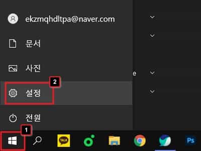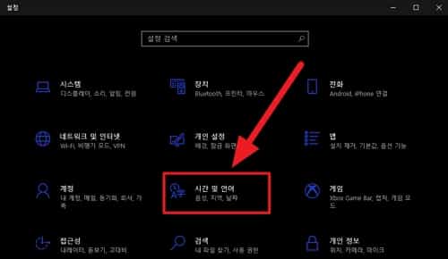 먼저 바탕화면 좌측 하단의 윈도우 아이콘을 클릭합니다. 이후 보이는 메뉴에서 시간 및 언어 메뉴에 접속합니다.