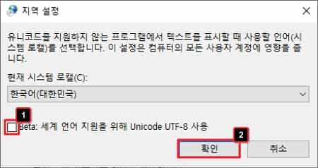 위 이미지와 같이 Beta: 세계 언어 지원을 위해 Unicode UTF-8 사용을 체크하고 확인을 눌러줍니다. 이후 시스템 다시 시작을 통해 다이렉트 X와 관련된 문제를 해결할 수 있습니다.