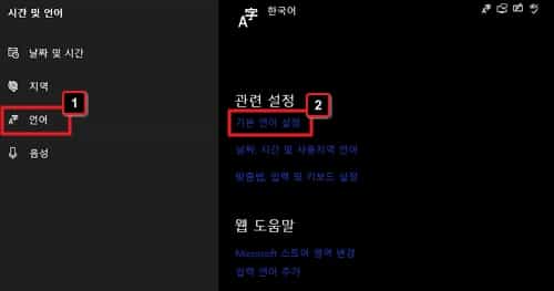시간 및 언어에 들어왔다면 좌측에 있는 언어 메뉴를 클릭합니다. 이후 우측 상단 혹은 스크롤 아래에 있는 기본 언어 설정에 들어갑니다.
