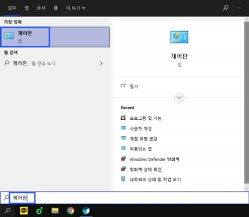 먼저 키보드 관련 설정을 변경하기 위해서는 제어판에 접속해야합니다. 검색 창에서 제어판을 검색하고 접속해줍니다.