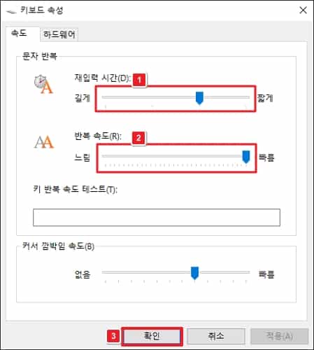 2. 반복 속도: 연속해서 입력하는 속도를 빠르게 할 수 있습니다. 재입력 시간은 빠르지만 반복 속도가 느리다면 버벅이는 현상이 발생할 수 있습니다.
