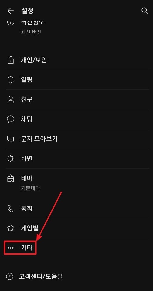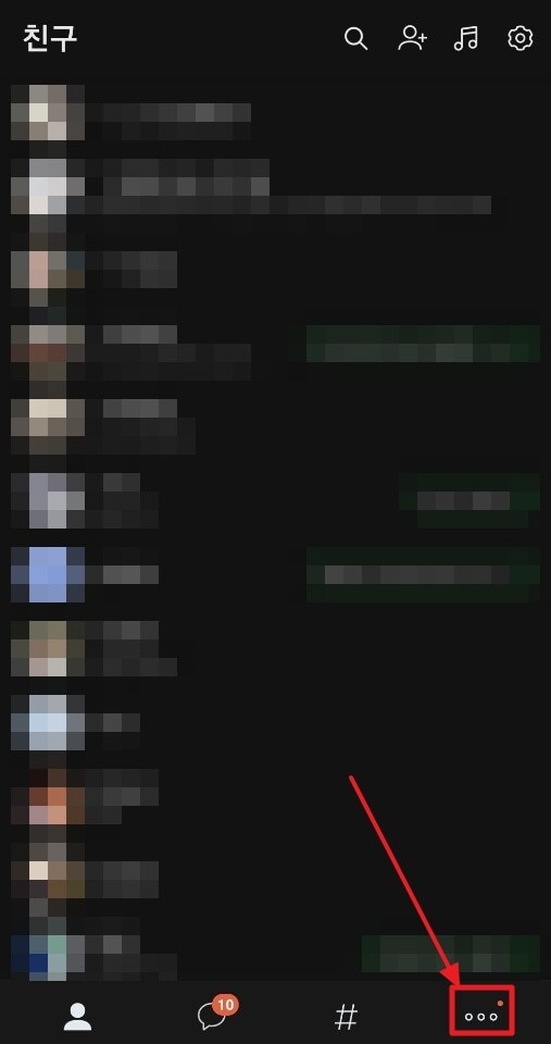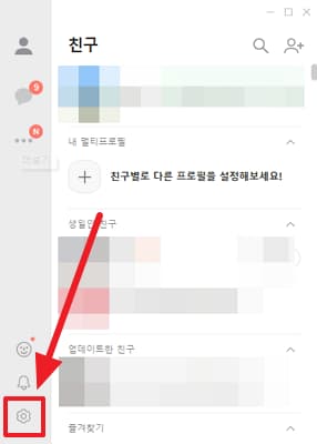 모바일 카카오톡에 접속하고 좌측 하단의 점 세개를 클릭합니다. 이후 우측 상단의 카카오톡 설정(톱니바퀴)을 클릭합니다.