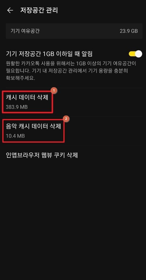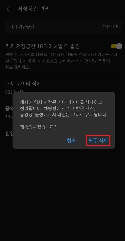 마지막으로 캐시 정보를 모두 삭제하면 저장공간을 확보할 수 있게 됩니다.