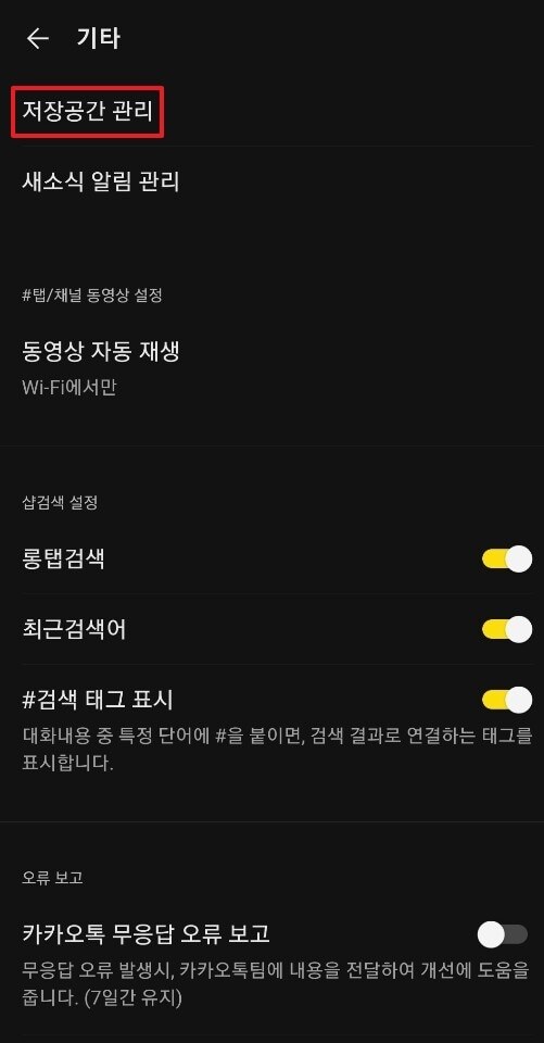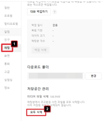 PC 카카오톡에서는 쉽게 파일을 정리할 수 있습니다. 설정 - 채팅 - 저장공간 관리에서 "모두 삭제"를 클릭합니다. 다음은 모바일 카카오톡 저장공간 관리입니다.