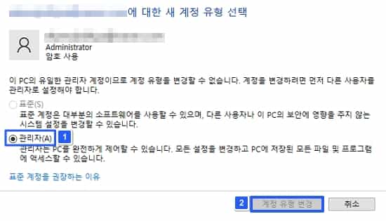 사용자 계정에서 현재 사용하는 사용자 계정 유형을 변경할 수 있습니다. 이미지를 참고하시길 바랍니다.