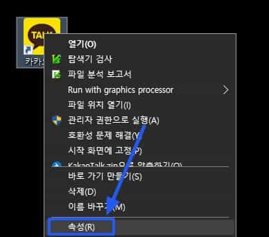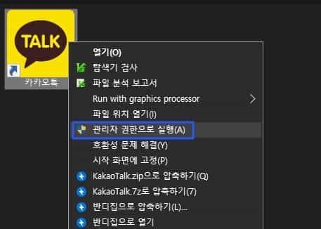 먼저 예시로 카카오톡을 관리자 권한으로 실행해보겠습니다. 카카오톡 우클릭-관리자 권한으로 실행을 눌러주면 간단하게 관리자 권한으로 실행을 할 수 있습니다. 관리자 권한으로 실행이 되지 않는다면 속성에 접속합니다.