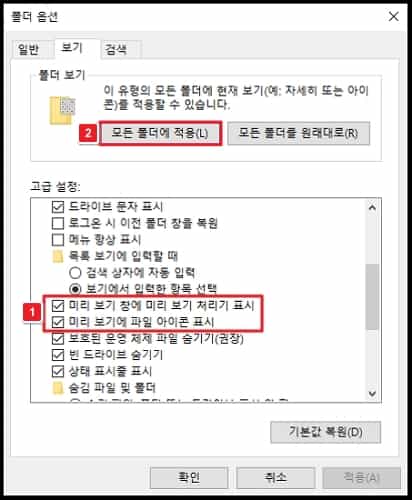 폴더 옵션에서 미리 보기와 관련된 항목을 모두 체크하고 모든 폴더에 적용을 눌러주면 정상적으로 미리 보기 창이 출력될 수 있습니다.