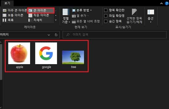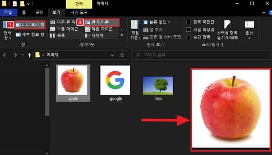 먼저 첫 번째는 기본적으로 큰 아이콘 설정으로 보여지는 모습입니다. 우측 이미지를 참고하여 미리 보기 창을 설정해두면 이미지와 같이 미리보기로 사진을 크게 볼 수 있습니다.