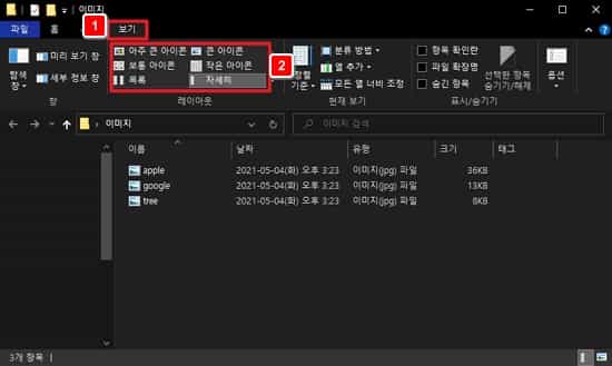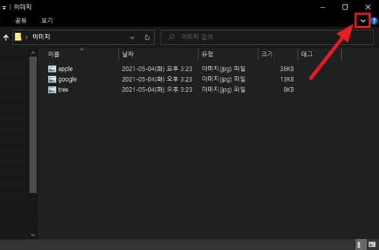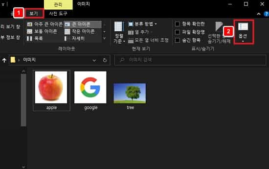 먼저 아무 폴더에 들어가서 우측 상단의 v 모양을 클릭합니다. 이후 보기 탭에서 사진 미리보기 설정을 사용할 수 있습니다.