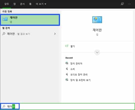 윈도우의 모든 설정은 제어판에서 설정이 가능합니다. 제어판을 입력하고 접속해줍니다.