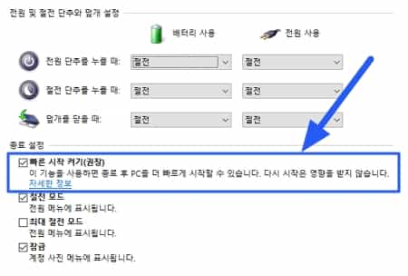 마지막으로 빠른 시작 켜기를 체크하면 모든 설정이 완료됩니다. 컴퓨터를 완전하게 종료 후 빠른 시작이 가능합니다.