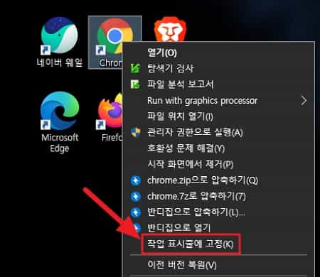작업표시줄에 고정할 아이콘을 선택하고 우클릭, 작업 표시줄에 고정을 클릭하면 적용이 됩니다.