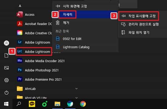 시작 프로그램에서도 아이콘을 옮길 수 있습니다. 원하는 앱을 우클릭하면 위 이미지와 같이 작업 표시줄에 고정을 선택할 수 있습니다.