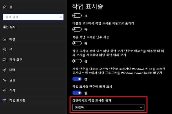 위 이미지와 같이 작업 표시줄 메뉴에서 화면에서 작업 표시줄 위치에 있는 설정을 바꿀 수 있습니다. 위, 아래, 오른쪽, 왼쪽으로 다양하게 작업 표시줄을 바꿀 수 있습니다.