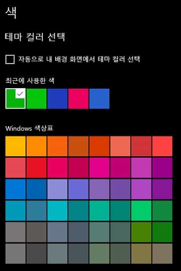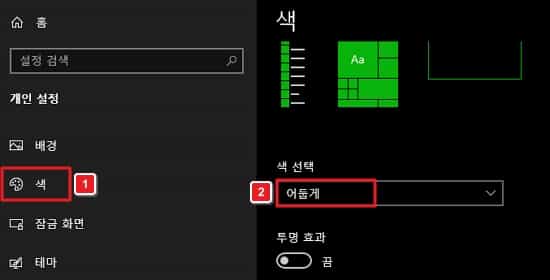 배경 테마색은 색 메뉴에서 선택할 수 있습니다. 색 선택에서 어둡게를 클릭하면 전체적인 창 테마가 검은색과 가까운 색으로 변경됩니다.