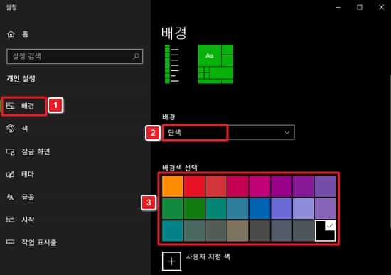 윈도우 테마 메뉴에서는 다양한 배경 색을 선택할 수 있습니다. 위 이미지와 같이 검은색 단색으로 배경을 설정하거나 사용자 지정 색을 통해 사용자의 눈에 편안한 색을 선택할 수 있습니다. 예시로는 검은색 단색을 선택했습니다.