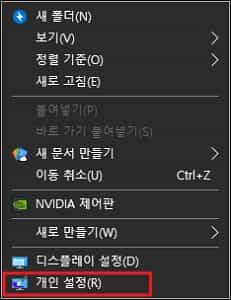 먼저 테마 설정을 위해 바탕화면 아무 곳이나 우클릭하고 개인 설정으로 접속합니다.