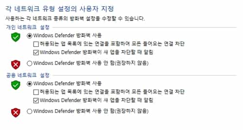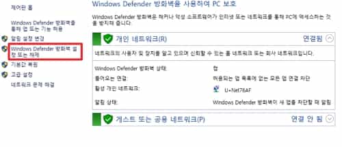 좌측 중단의 윈도우 디펜더 방화벽 설정 또는 해제 메뉴로 접속합니다. 개인 네트워크와 게스트 또는 공용 네트워크를 나눠서 방화벽 해제 및 설정할 수 있습니다.