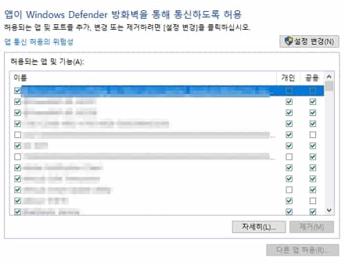 다양한 앱 중 원하는 앱 방화벽을 개인/공용에 나눠서 설정 및 해제할 수 있습니다. 이 방법은 전체 방화벽이 아닌 일정 부분만 설정이 가능합니다.