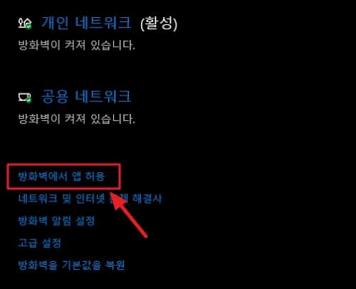 방화벽 및 네트워크 보호 메뉴로 접속하고 방화벽에서 앱 허용을 선택합니다.