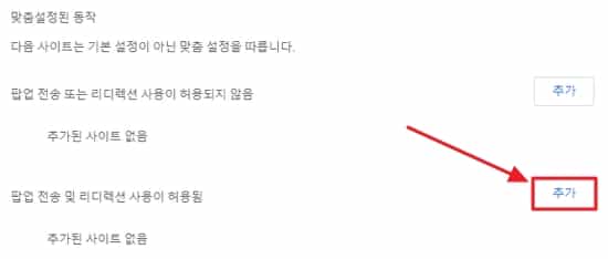 팝업을 사이트 단위로 허용하고싶다면 위 이미지와 같이 팝업 전송 및 리디렉션 사용이 허용됨 옆에 있는 추가 버튼으로 원하는 사이트만 팝업을 허용할 수도 있습니다. 역으로 원하는 사이트만 팝업을 차단하는 방법도 있습니다.