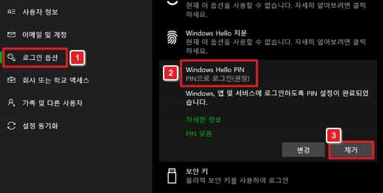 계정 메뉴를 접속하고 로그인 옵션 탭을 클릭합니다. Windows Hello PIN(핀번호 입력으로 로그인)을 클릭하면 설정했던 핀번호를 제거할 수 있습니다.