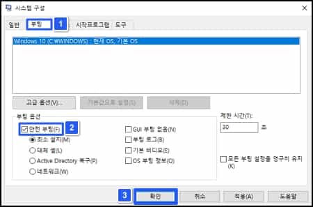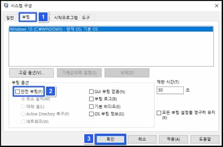 안전모드에서 설정할 수 있는 기능입니다. 부팅 옵션에서 안전 부팅을 해제하고 확인을 눌러주면 다음 부팅부터는 다시 윈도우를 사용할 수 있습니다.